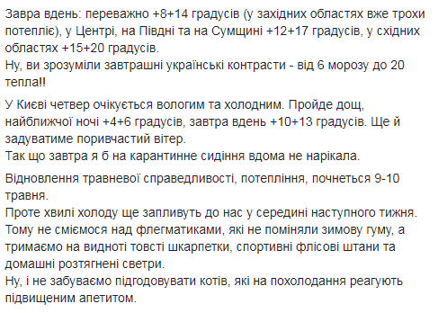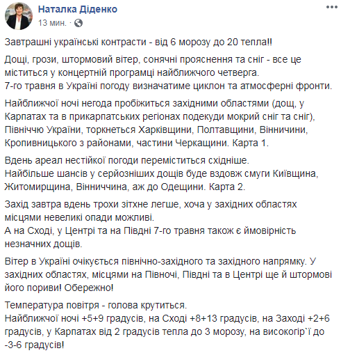 Об этом сообщает синоптик Наталья Диденко на свое Facebook-странице.