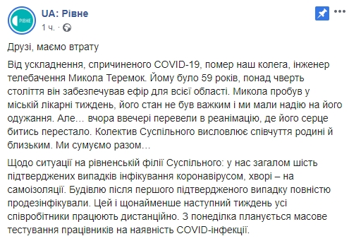 "От осложнения, вызванного COVID-19, умер наш коллега, инженер телевидения Николай Теремок. Ему было 59 лет, более четверти века он обеспечивал эфир для всей области. Николай пробыл в городской больнице неделю, его состояние не было тяжелым и мы надеялись на его выздоровление. Но ... вчера вечером перевели в реанимацию, где его сердце биться перестало. Коллектив Суспильного выражает соболезнования семье и близким. Мы скорбим вместе", - сказано в публикации.