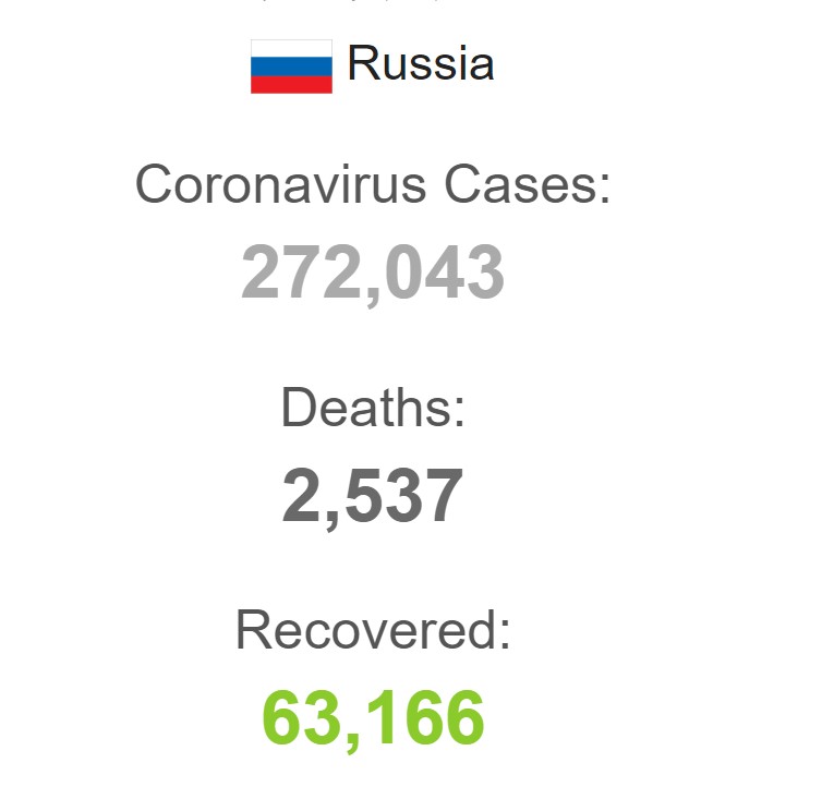 Отметим, что согласно официальной статистике, в России коронавирус обнаружили у 272 043 человек, из них 2 537 - умерли.