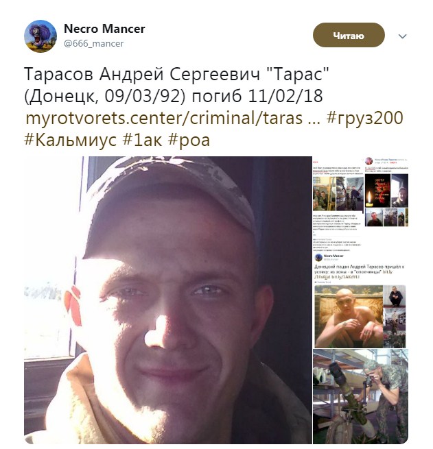 По его словам "Тарас" погиб в феврале 2018 года. Боевики в соцсетях напомнили о годовщине его ликвидации.