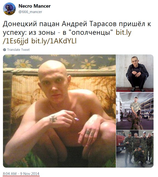 "Донецкий пацан Андрей Тарасов пришел к успеху: из зоны - в "ополченцы", - написал он.