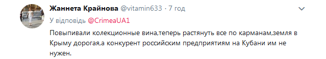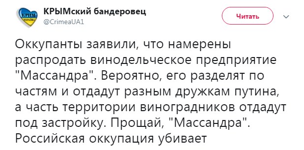 "Оккупанты заявили, что намерены распродать винодельческое предприятие "Массандра". Вероятно, его разделят по частям и отдадут разным дружкам путина, а часть территории виноградников отдадут под застройку. Прощай, "Массандра". Российская оккупация убивает", - написал блогер КРЫМский бандеровец.