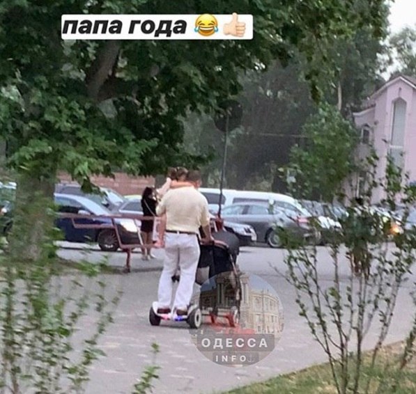 На нем изображен папа, который одной рукой держит ребенка на руках, а второй везет коляску. И все бы выглядело привычно, если бы не одна деталь. Отец не идет по дороге ногами, а едет на гироборде.