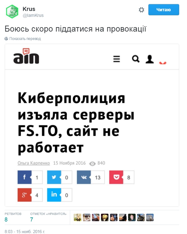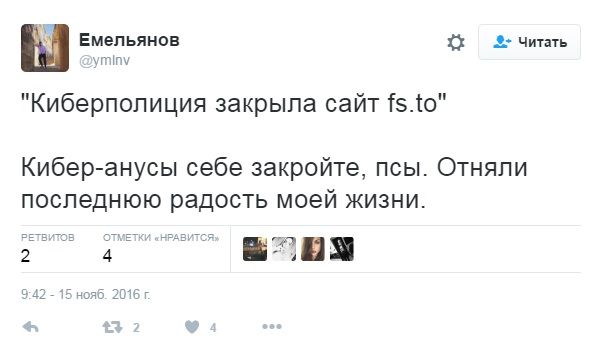 Департамент киберполиции Национальной полиции Украины прекратил работу группу пиратских онлайн-сервисов по просмотру видеоконтента, куда входили сайты FS.TO, BRB.TO, FS.UA и CXZ.TO.