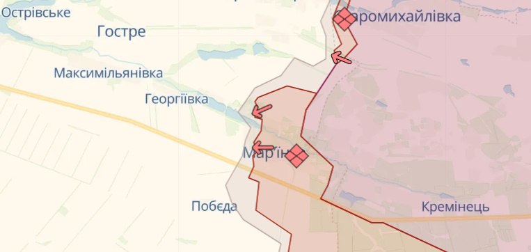 Марьинское направление: за сутки ВСУ отразили 15 атак возле Марьинки и Новомихайловки Донецкой области. Россияне обстреляли из артиллерии до 15 н. п., в частности, Красногоровку, Марьинку, Георгиевку, Победу, Новомихайловку.