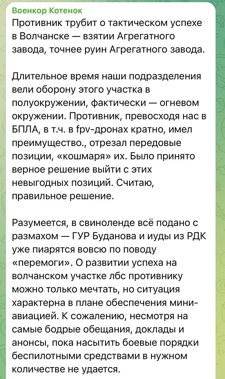 "Российские военкоры признали, что оккупантам пришлось отступить с "невыгодных позиций" в Волчанске. Под контроль ВСУ перешел разрушенный Агрегатный завод", - написал журналист, добавив скрин с детальным объяснением "решения" россиян.