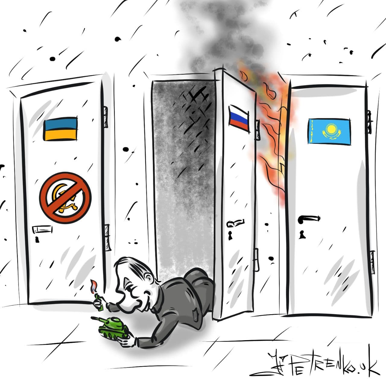 Меткие карикатуры, по поводу введения российских "миротворцев" в Казахстан, опубликовал их автор Андрей Петренко в своем Telegram-канале.