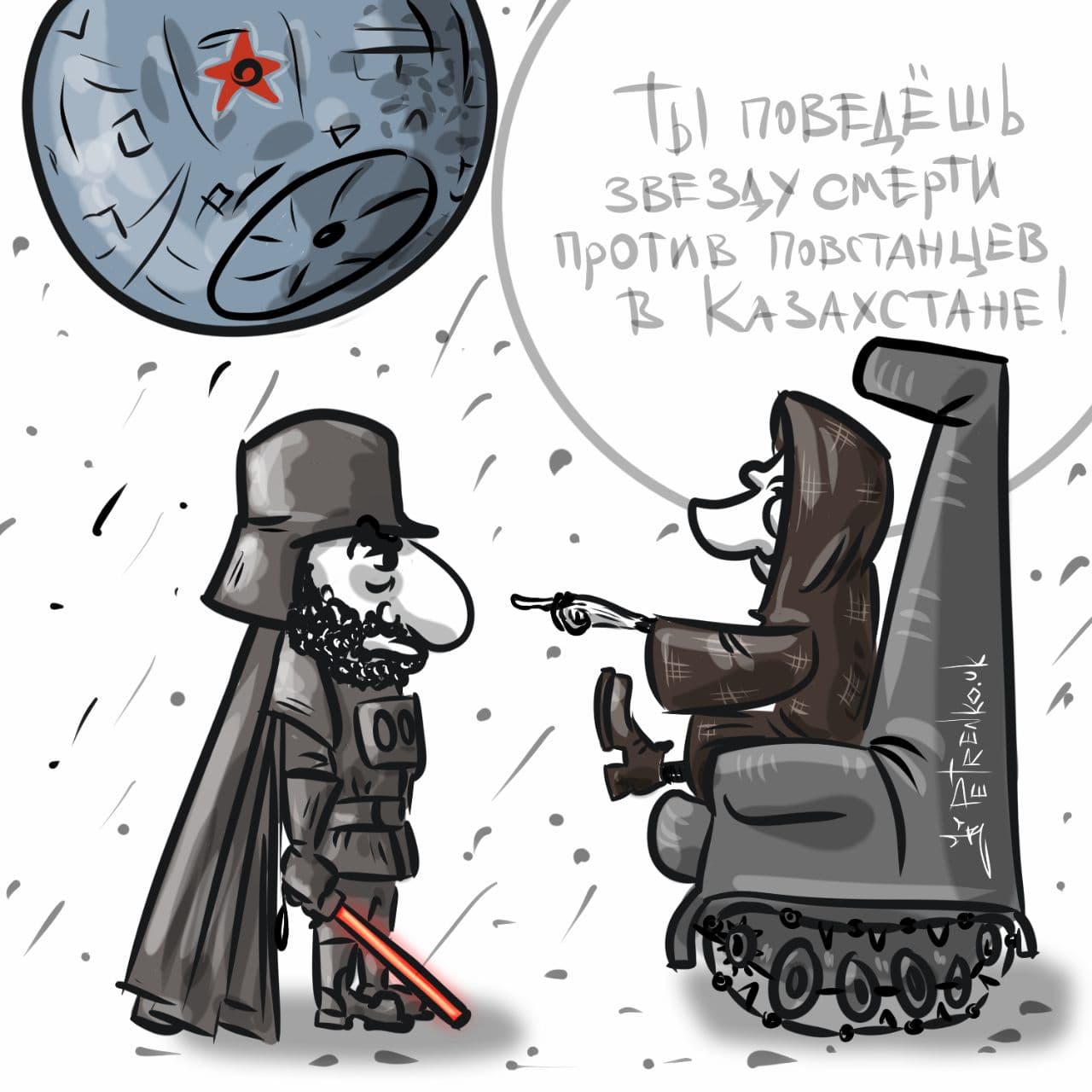 На третьей карикатуре изображены два человека. Один из них – повелитель, он сидит на кресле, под которым виднеется гусеничная лента, и говорит другому, подчиненному: "Ты поведешь звезду смерти против повстанцев в Казахстане!".