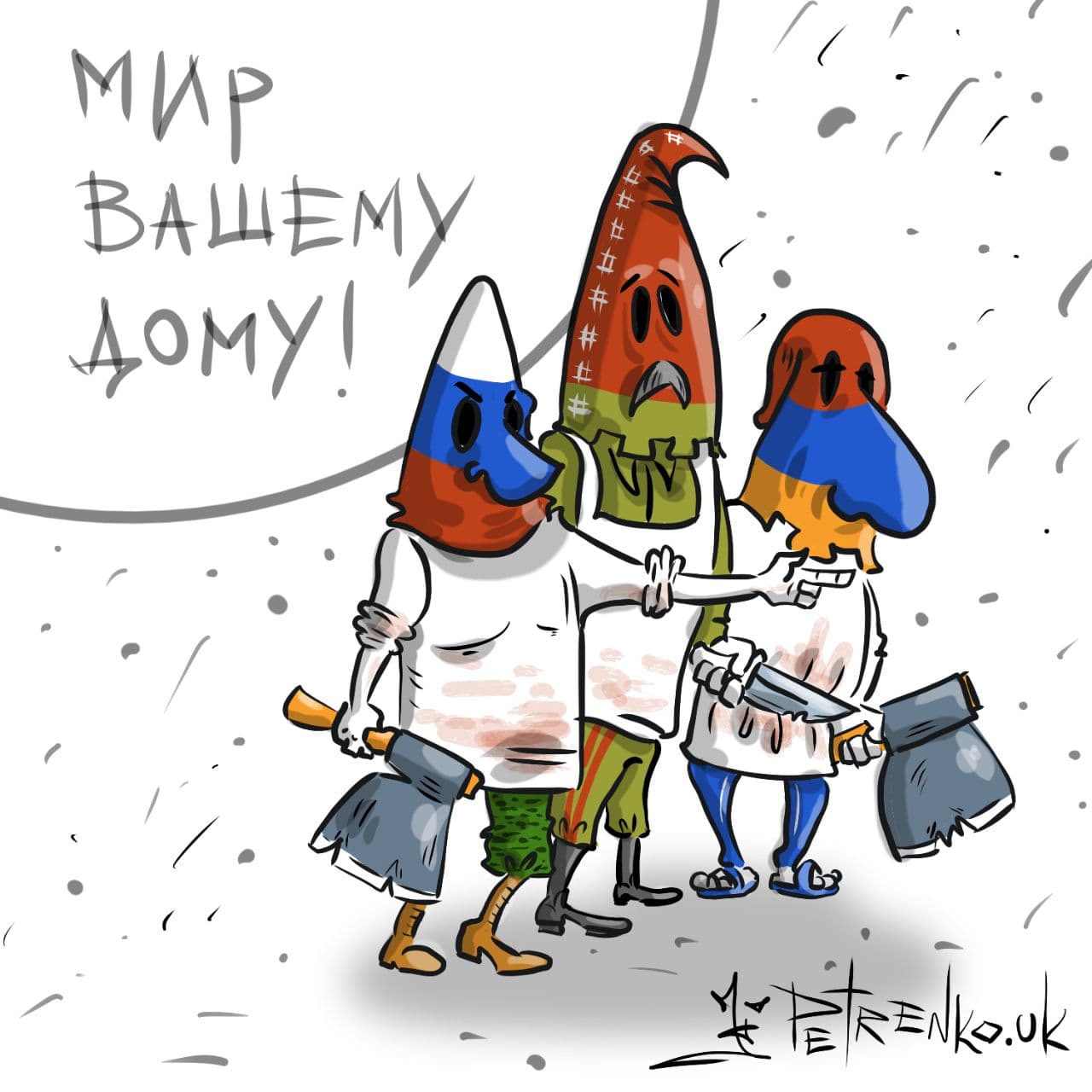 На первой карикатуре изображено три палача с мешками на голове расцветок российского, армянского и белорусского флагов, в руках они держат топоры.