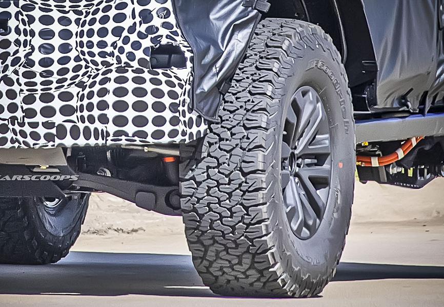Как можно увидеть на фото, Ford Bronco Raptor будет оснащен шинами BF Goodrich All-Terrain T/A KO2 LT315/70R17 внешним диаметром 35 дюймов, которые поставляются для версии Sasquatch Pack. Заметны и амортизаторы Fox – такими оснащается спортивный пикап Ford F-150 Raptor.