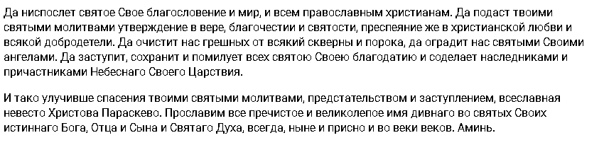 Многие верят, что образ святой Параскевы приносит в дом благополучие и счастье, а также спасает от болезней, таких как лихорадка, зубная, головная боль и не только. Иконы святой Параскевы принято украшать цветами и травами, которые со временем используют как целебные. Их прикладывают к больным местам, купают детей в воде с этими травами, а также варят из них отвары для захворавших. А в связи с тем, что в народе святая славится еще и как "бабья заступница", то женская половина в этот день может попросить для себя благополучные роды или помощь с зачатием ребенка, а молодые девушки могут попросить хорошего мужа.
