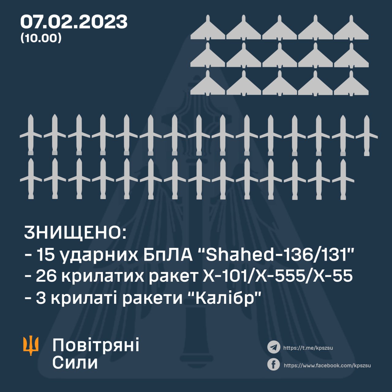 Согласно информации Воздушных сил ВСУ, в начале суток 7 февраля, враг выпустил по Украине 20 ударных БпЛА типа "Shahed-136/131"; 29 крылатых ракет Х-101/Х-555/Х-55; 4 крылатые ракеты Х-22; 3 крылатые ракеты морского базирования "Калибр"; 3 баллистические ракеты "Искандер-М"; 5 зенитных управляемых ракет С-300.