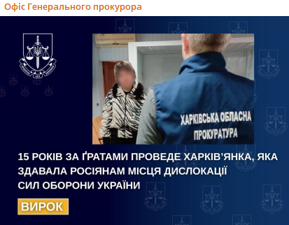 "За поддержание публичного обвинения прокурорами Харьковской областной прокуратуры Киевский райсуд Харькова признал 46-летнюю жительницу города виновной в государственной измене в условиях военного положения (ч. 2 ст. 111 УК Украины)", – говорится в сообщении.