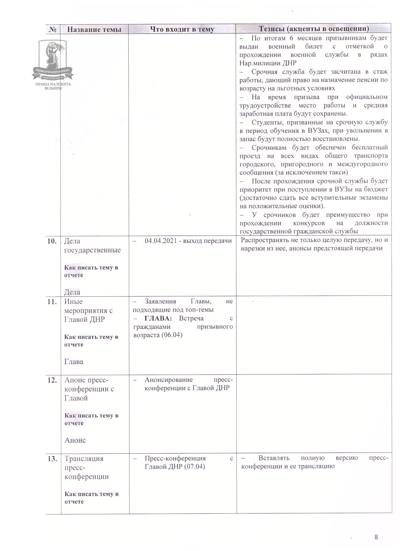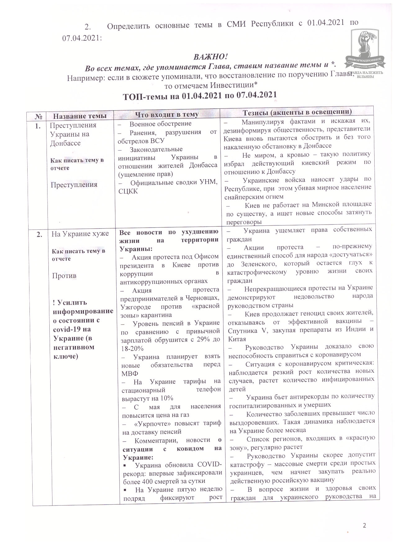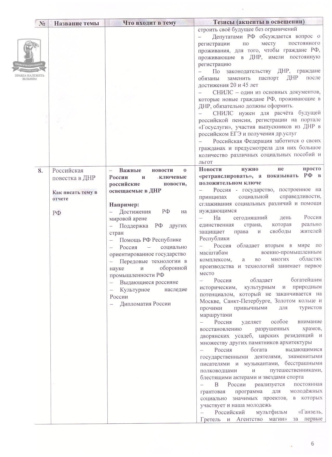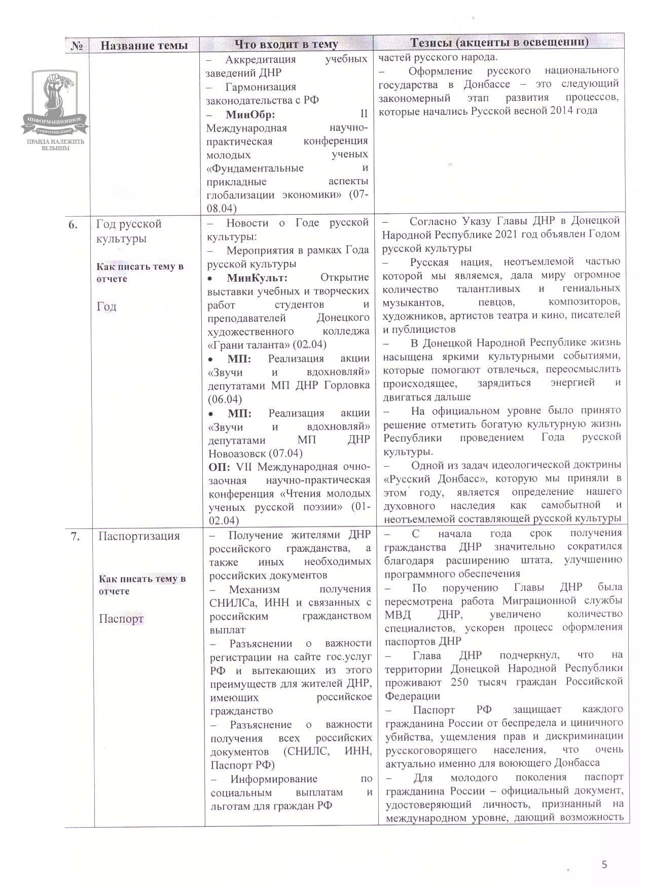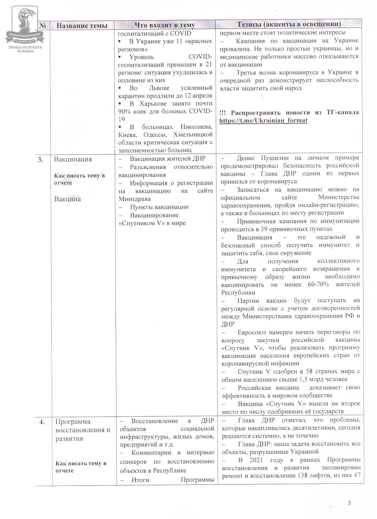 В частности, в этом документе пропагандистам ДНР рекомендуют регулярно писать об Украине в негативном ключе, прославлять эффективность российской вакцины, напоминать местному населению о том, как прекрасен "русский мир" и как скоро Донбасс сможет "интегрироваться в российское пространство".