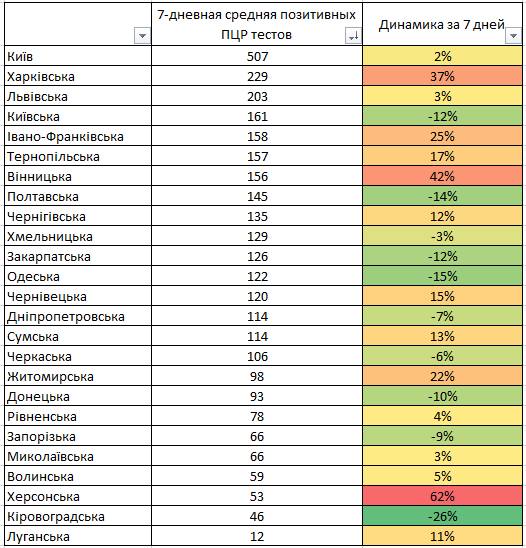 "Вчера было проведено 32 812 ПЦР-теста, из них 6474 оказались позитивными. Суточные темпы изменения - 19,7%, недельные - 16,1%. Наиболее заметный рост в Харьковской, Львовской, Тернопольской, Винницкой и Черниговской областях", - отметил Истребин.