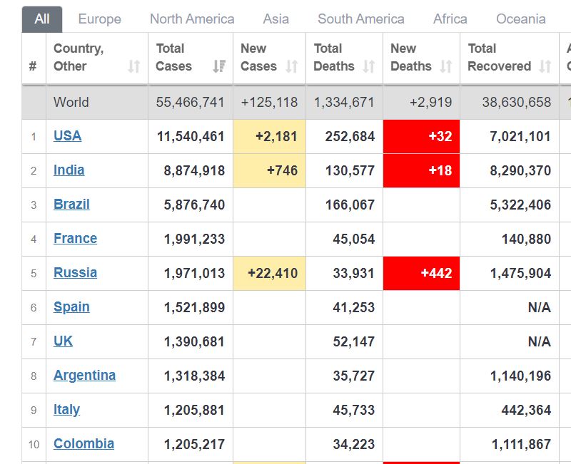 По состоянию на 17 ноября, коронавирусом в мире заболели 55 466 741 людей, из них 1 334 671 человек умер.
