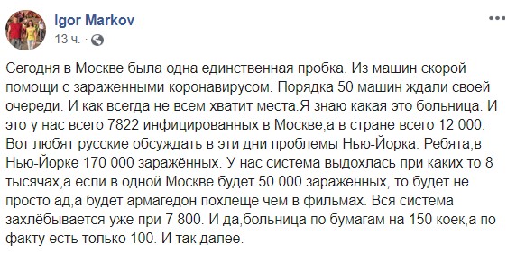 "Вот любят русские обсуждать в эти дни проблемы Нью-Йорка. Ребята,в Нью-Йорке 170 000 зараженных. У нас система выдохлась при каких то 8 тысячах,а если в одной Москве будет 50 000 зараженных, то будет не просто ад, а будет армагедон похлеще чем в фильмах. Вся система захлебывается уже при 7 800. И да, больница по бумагам на 150 коек,а по факту есть только 100. И так далее", - подытожил Марков.