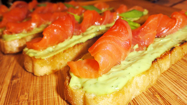 Семгу порезать тонкими ломтиками и пинцетом удалить все косточки. На каждый ломтик поджаренного хлеба намазать массу с авокадо. Сверху выложить свернутые спиралью ломтики семги и украсить зеленым луком или рукколой.