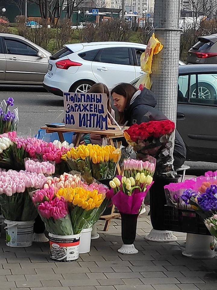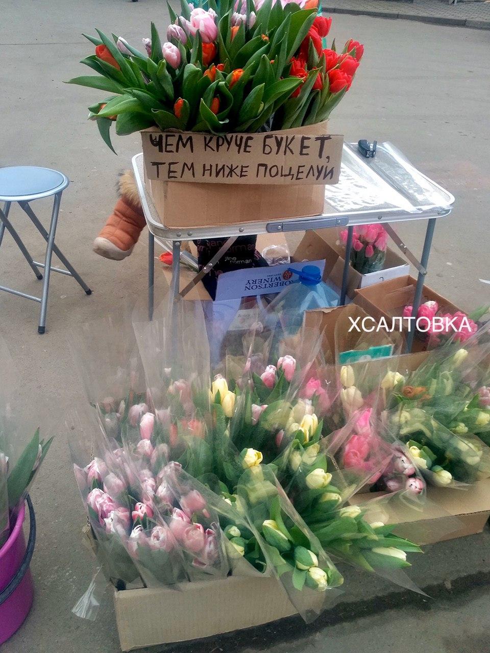 Одна из девушек, продающая цветы в день праздника, поместила рядом объявление о том, что ее тюльпаны "заряжены" на интим.