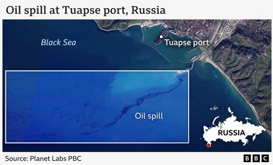 Спутниковые снимки зафиксировали несколько километровый разлив нефтепродуктов в Черном море после дроновых ударов Службы безопасности по танкеру и портовому терминалу в российском Туапсе.