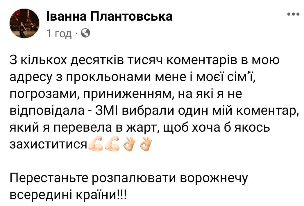 Отметим, сразу после громкого скандала Плантовская закрыла свои социальные сети, но недавно опять открыла доступ к ним. Несколько дней назад девушка поделилась новым снимком в своем Facebook, нарвавшись на новую волну хейта. Более того, девушка отметила в комментариях, что ей просто завидуют те, "кто не имеют своих денег, потому считают чужие".