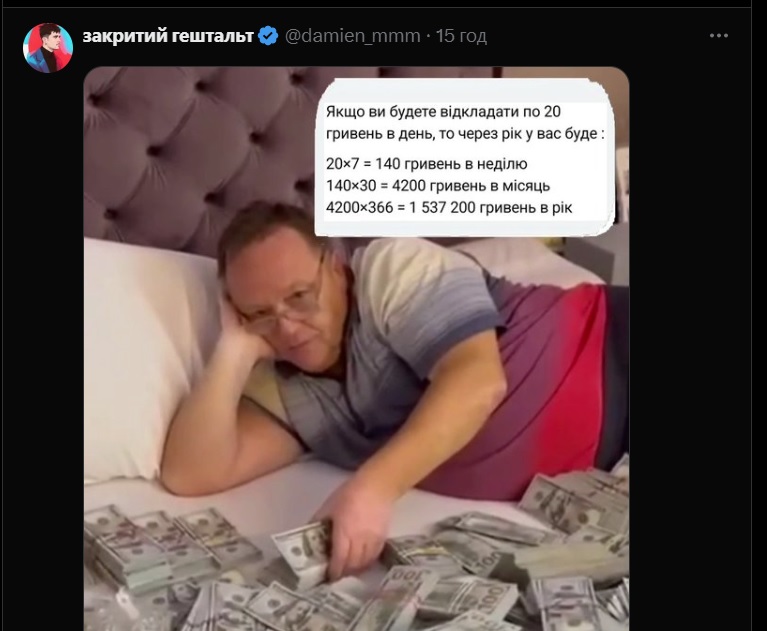Пользователь Threads с ником yagodkinaaaa посчитала сколько можно накопить денег, если откладывать по 20 гривен в день, и повеселила этим украинцев в Х.