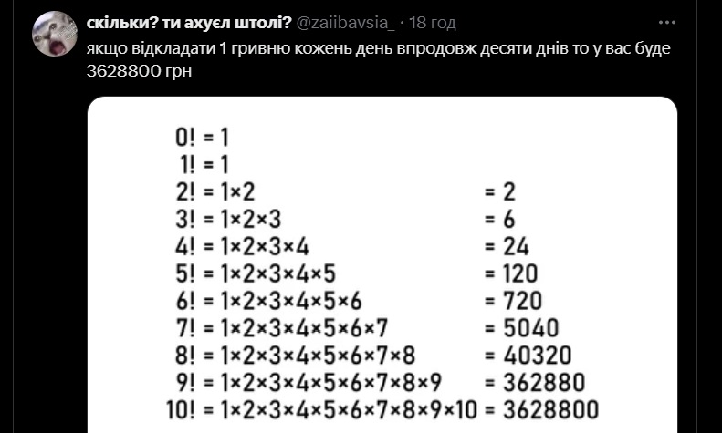 Так, девушка почему-то посчитала потенциальные сбережения не в один прием (20 гривен х 366 дней), а путем геометрической прогрессии по дням, потом неделям, а затем месяцам. Таким образом, она получила результат, что человек, откладывающий по 20 гривен в день, за год может стать миллионером.