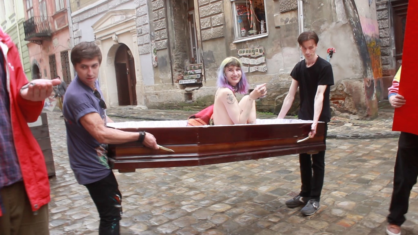В воскресенье, 6 июня, по центру Львова, голую девушку носили в гробу.