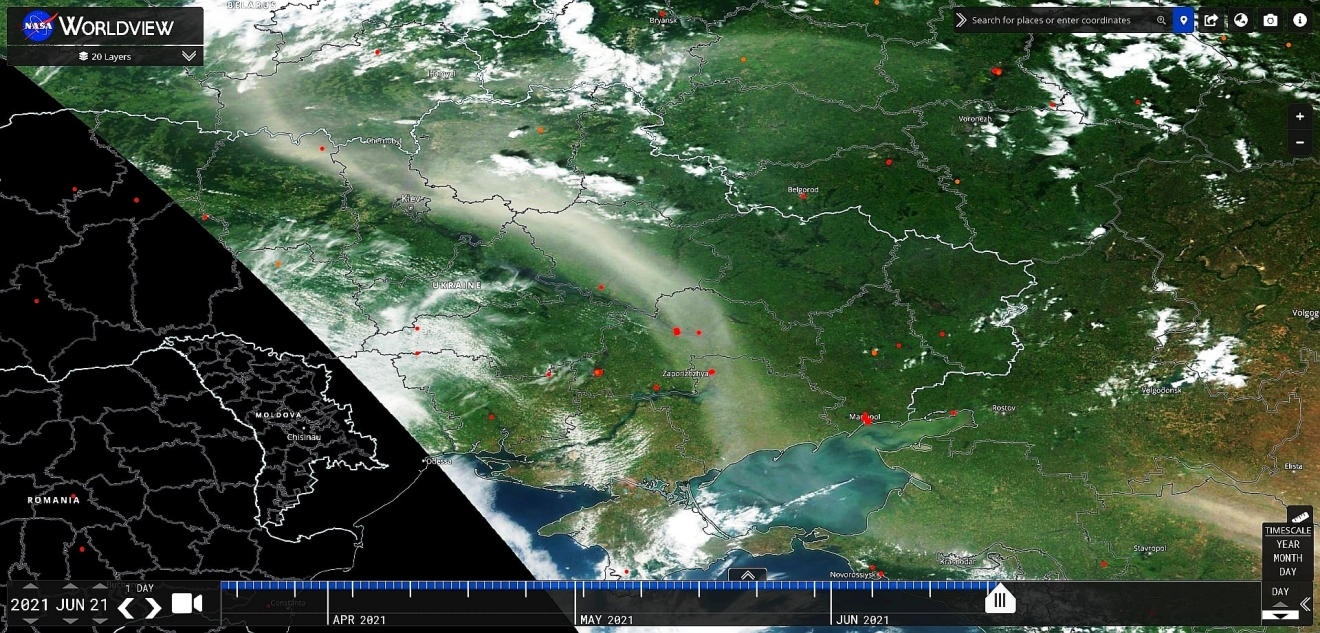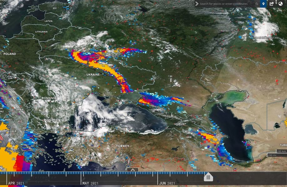 "Сегодня из космоса наблюдается песчаная буря (пылевое облако) над Левобережной Украиной, которую нанесло с Астраханских полупустынных степей. Задевает также и Киев", - говорится в сообщении.