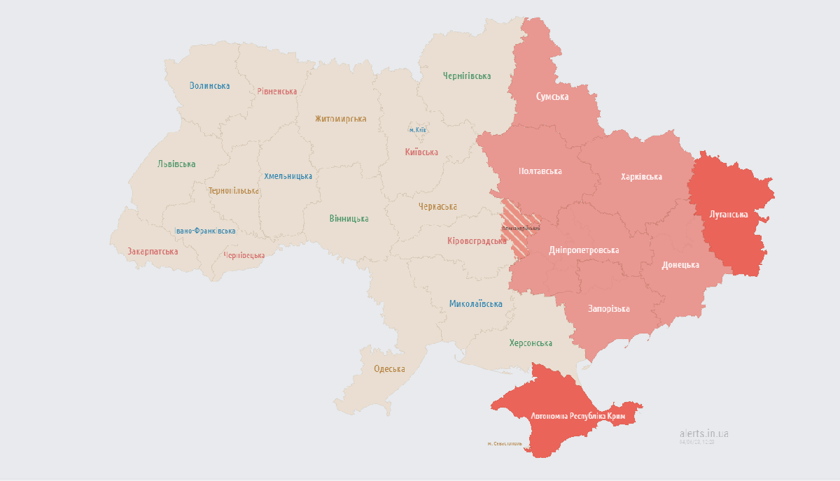 Воздушная тревога объявлена в Харьковской, Сумской, Полтавской, Днепропетровской, Запорожской, одном из районов Кировоградской областей, а также в Донецкой и Луганской областях и АРК Крым.