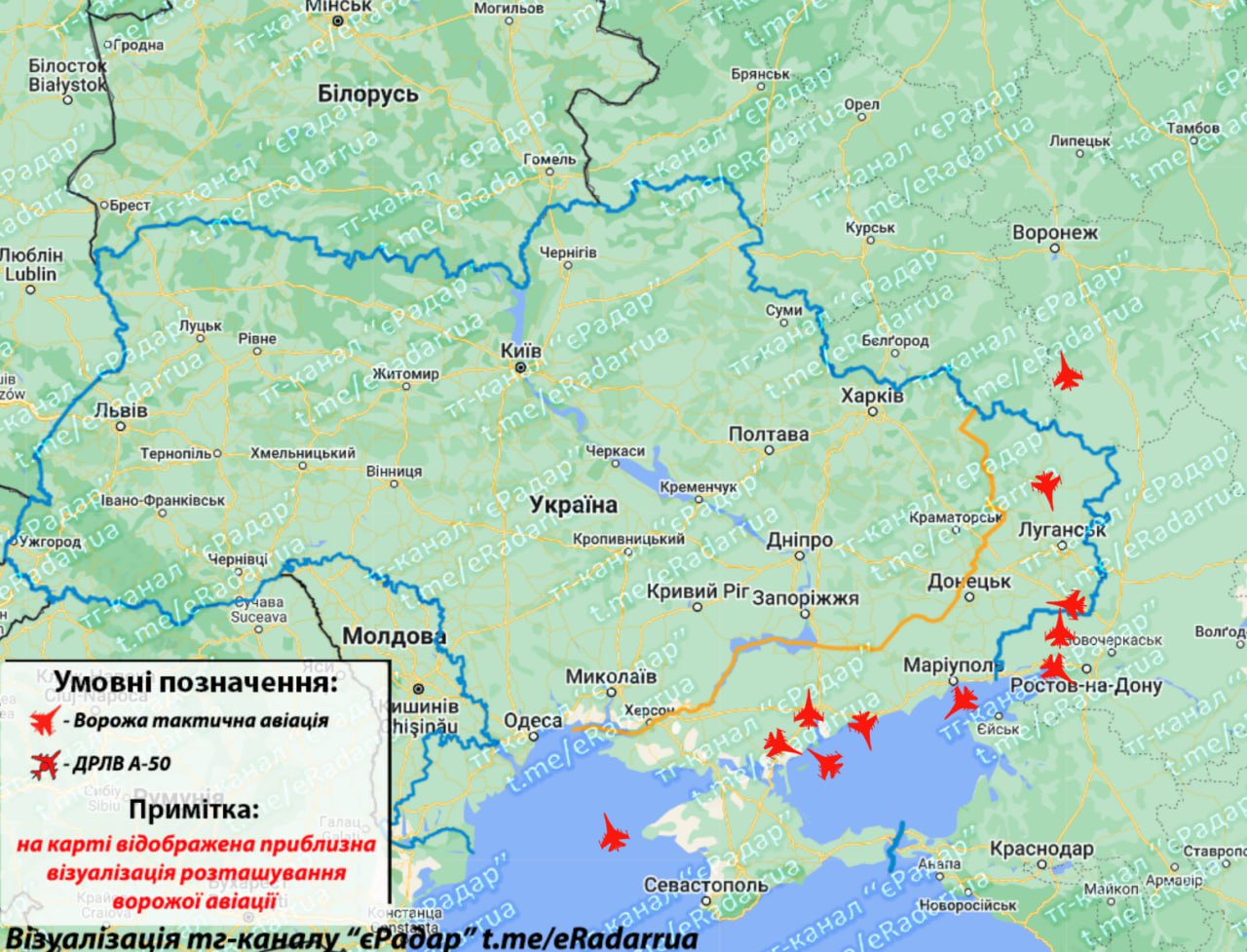 Паблик "еРадар" показал ориентировочную ситуацию по активности вражеской авиации над временно оккупированными территориями и за пределами Украины. Пишут о вылете МиГ-31К.