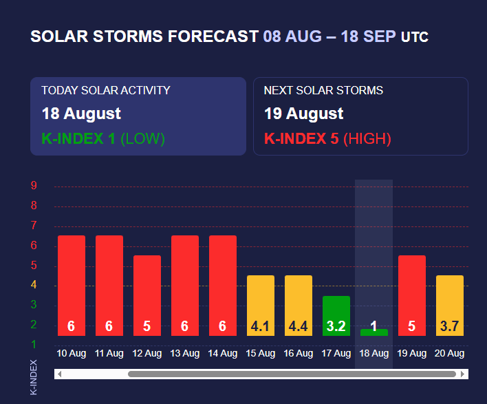 Согласно прогнозу экспертов, ожидается солнечная активность с К-индексом 5 (красный уровень), что соответствует сильной магнитной буре. Следует заметить, что эксперты не дают долгосрочного прогноза колебаний геомагнитного поля Земли, поскольку солнечная активность очень изменчива и ситуация может изменяться даже до нескольких раз в сутки.