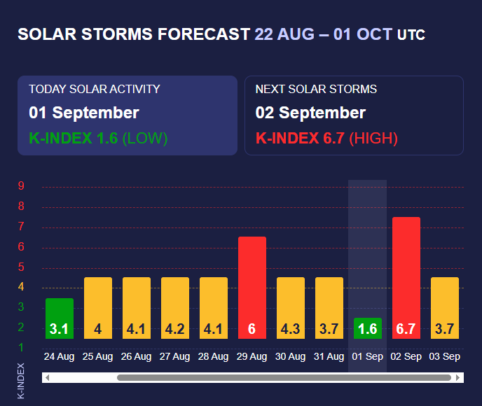 После короткого перерыва во вторник, 2 сентября, Землю снова атакует сильная магнитная буря с К-индексом 6,7 ( G-2).