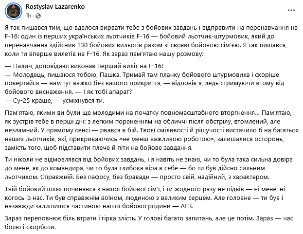 Летчик-штурмовик Воздушных сил Вооруженных сил Украины Ростислав Лазаренко рассказал, что Павел Иванов, погибший 12 апреля, был одним из первых украинских летчиков F-16, боевых летчиков-штурмовиков, который до переобучения совершил 130 боевых вылетов.