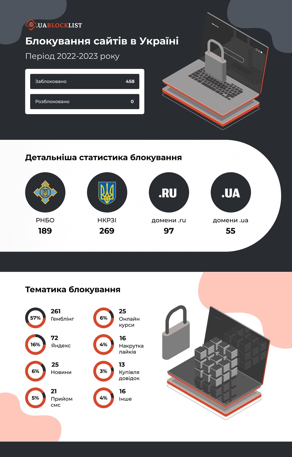 Поданным Uablocklist, по состоянию на середину 2023 к списку прибавили около 500 запрещенных сайтов в Украине. На подавляющее большинство санкции наложили только в 2022-23 (66 – в 2022 году, 388 – в 2023). За этот период СНБО заблокировал 189 интернет-ресурсов, а структурное подразделение Госспецсвязи – Национальный центр оперативно-технического управления электронными коммуникационными сетями Украины (НЦУ) еще 269 сайтов. Из них 97 ресурсов имеют домен.ru, 55 – домен .ua. Ни один из запрещенных сайтов не был разблокирован. Эксперты Uablocklist проанализировали запрещенные сайты Украины по сферам деятельности. Результаты следующие: