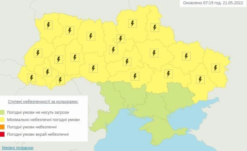 "21 мая днем в Украине, кроме южных областей, грозы, в западных и северных областях порывы ветра 15-20 м/с", - говорится в предупреждении.
