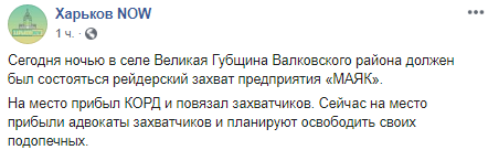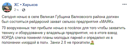 В ночь на 24 июля в селе Великая Губщина Харьковской области более полусотни вооруженных мужчин, в том числе боевиков ЛДНР и граждан России, пытались совершить рейдерский захват сельхоз предприятия "Маяк".