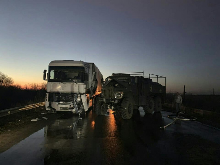 На опубликованных снимках видно, что там столкнулись грузовые автомобили, один из которых принадлежит военным.