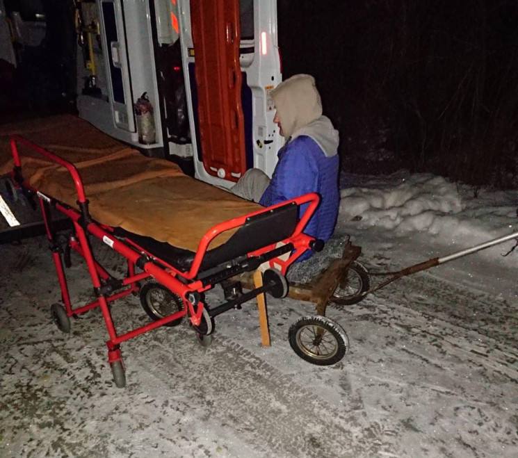 В Харьковской области медикам скорой помощи пришлось более одного километра везти пациента на хозяйственной тележке.