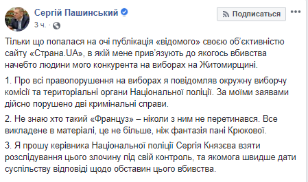 "Только что попалась на глаза публикация "известного" своей объективностью сайта "Страна.UA", в которой меня привязывают к какому убийства вроде человека моего конкурента на выборах в Житомирской", - написал он на своей странице в Facebook.