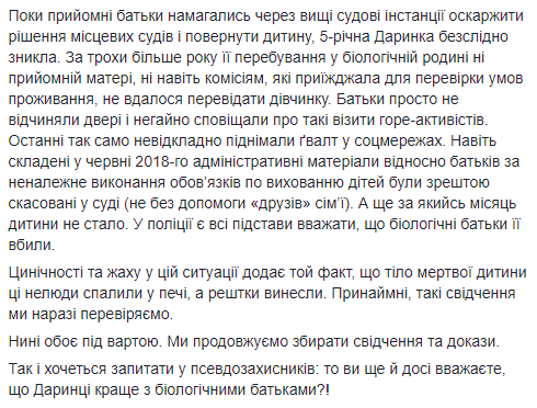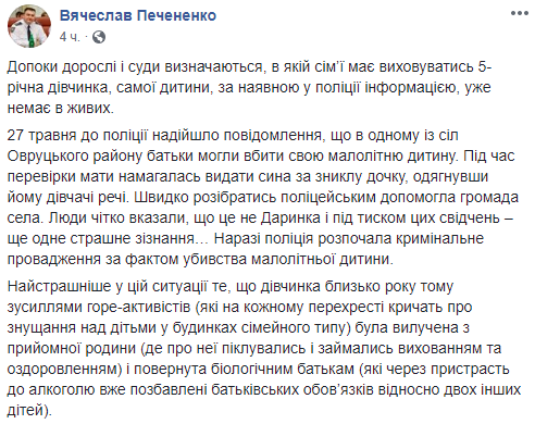 "Циничности и ужаса в этой ситуации придает тот факт, что тело мертвого ребенка эти нелюди сожгли в печи, а останки вынесли. По крайней мере, такие свидетельства мы пока проверяем. Сейчас оба под стражей", – написал Печененко.