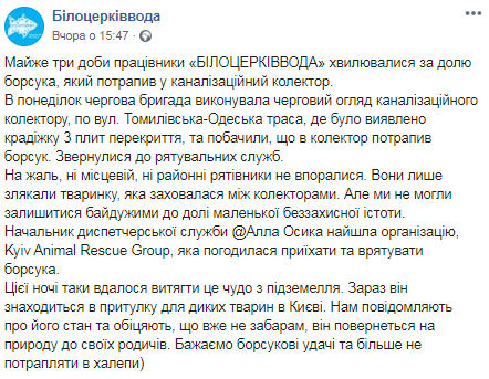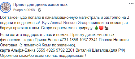 Рабочие обнаружили животное во время осмотра канализационного коллектора и обратились к спасателям. Однако ни местные, ни районные службы спасения не справились. Диспетчеры предприятия не сдались и обратились к организации Kyiv Animal Rescue Group, спасатели которой приехали и все таки вытащили животное.