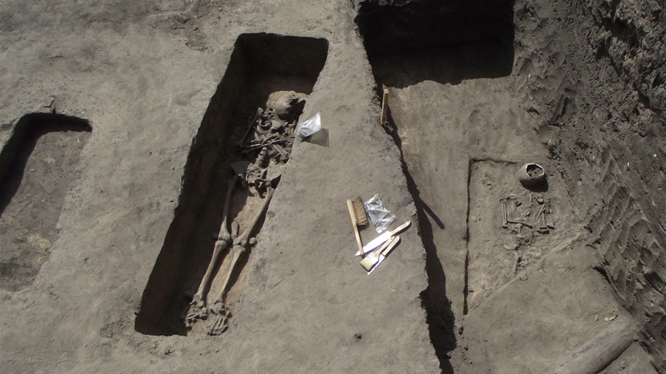 "В северо-восточной части раскопа нашли четыре древних захоронения: два принадлежат взрослым лицам, еще одно девушке-подростку и младенцу. Одно из взрослых захоронений частично повреждено уже в советское послевоенное время, когда от соседней многоэтажки прокладывали трубу канализации. Все захоронения осуществлены по христианскому обряду – головами возложенные на запад", - сказал журналистам кандидат исторических наук Александр Прядко.