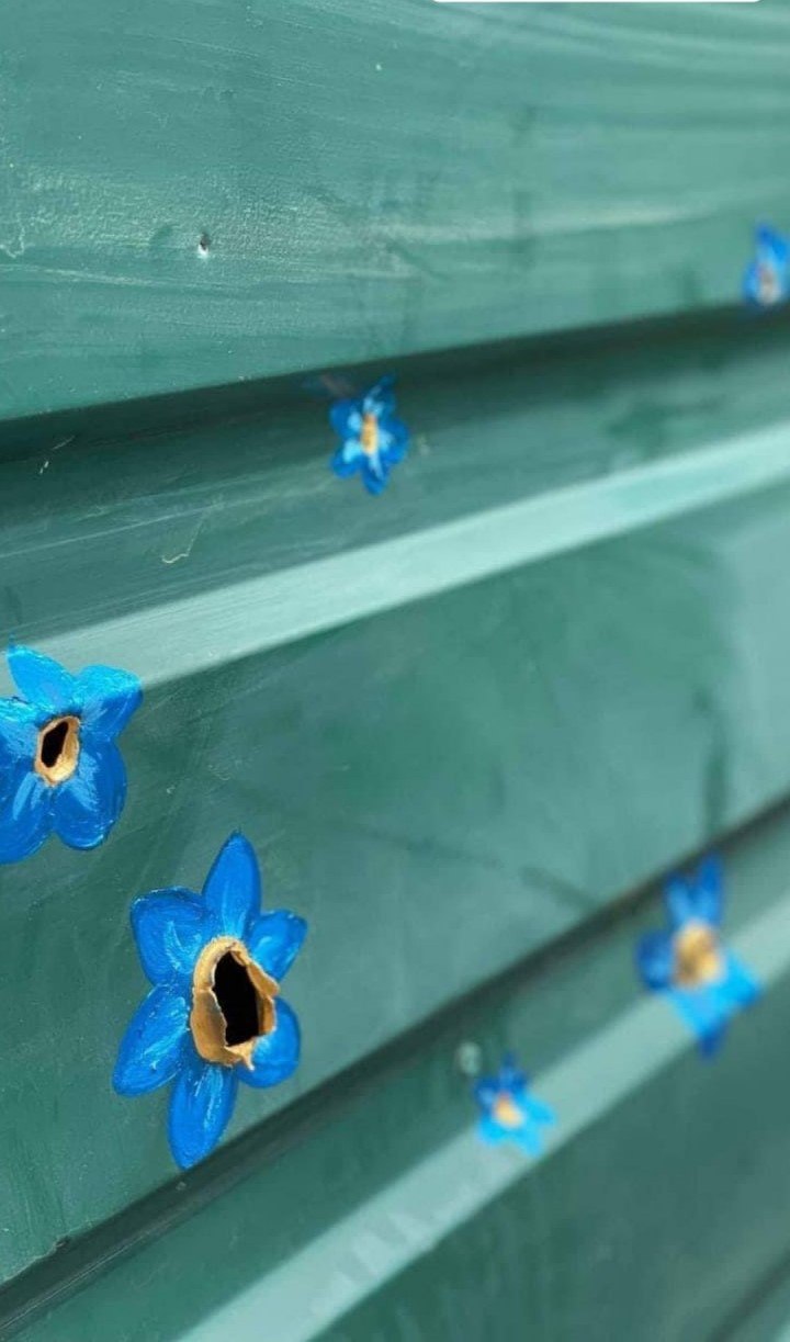 В городе Буча Киевской области, где во время оккупации зверствовали россияне, местные жители превращают в цветы следы от вражеских пуль на своих заборах, еще раз подтверждая созидательность и креативность украинской нации.