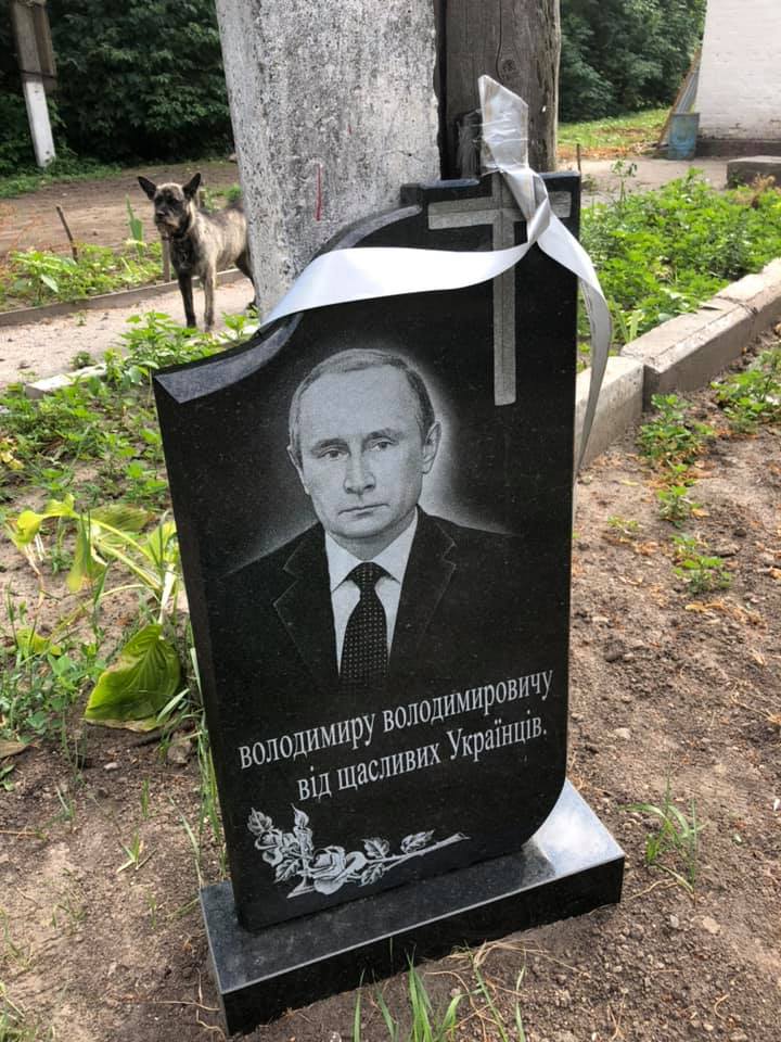 Под фотографией пользователи поделились своими соображениями о том, как должен на самом деле выглядеть надгробный камень президента страны агрессора, а также оценили чувство юмора авторов арт-объекта.
