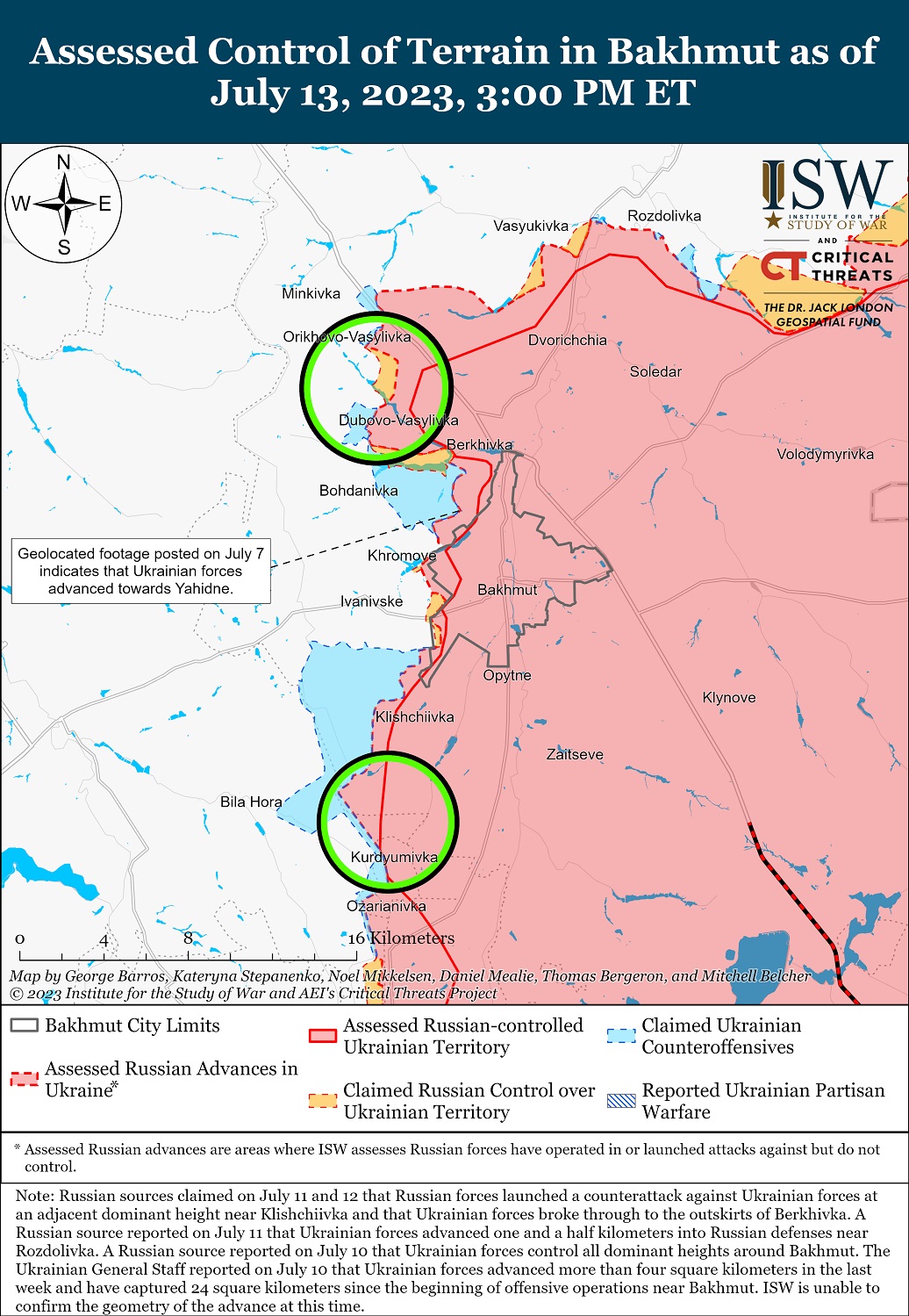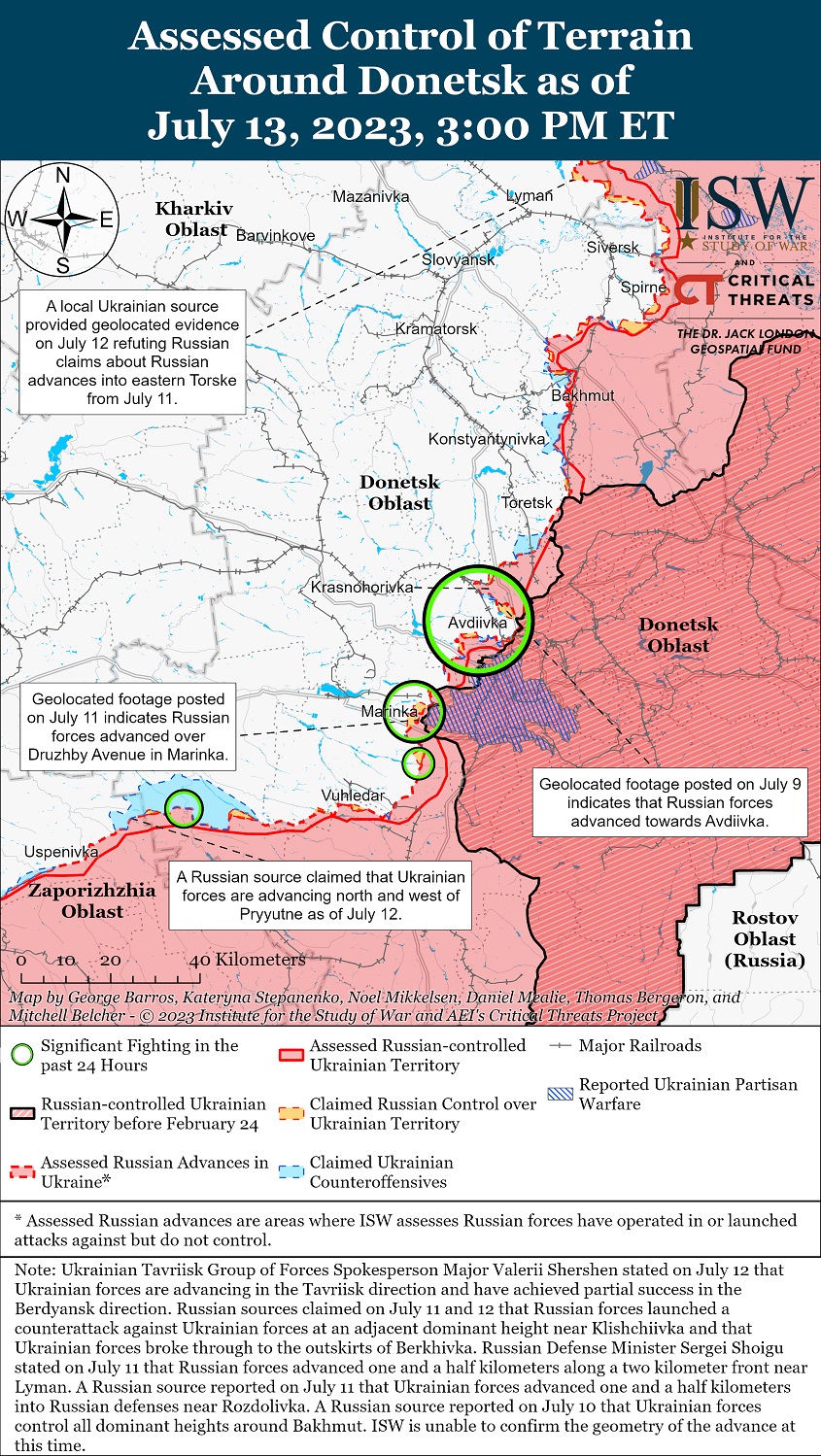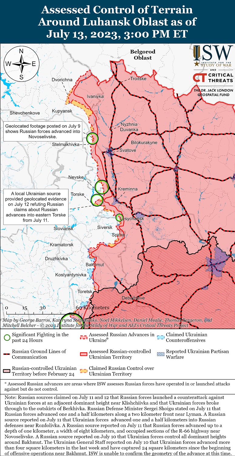 13 июля российские силы совершили ограниченные наземные атаки вокруг Бахмута. Украинский Генштаб сообщил, что украинские силы отразили все российские атаки вблизи Берховки. Череватый сообщил, что вблизи Клещеевки действуют неопределенные чеченские формирования.