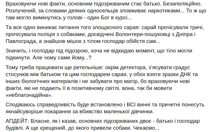 Ситуация в селе становится все напряженнее. Ведь непонятно, как десятилетний брат не в состоянии объяснить куда и как пропала его младшая сестра. И почему тело девочки было обнаружено в том месте, где до этого трижды прочесывали Каждый угол. По информации жителей села мама девочки злоупотребляет алкоголем, а отец употребляет наркотики, поэтому не известно, какую роль они могли сыграть в данном преступлении.