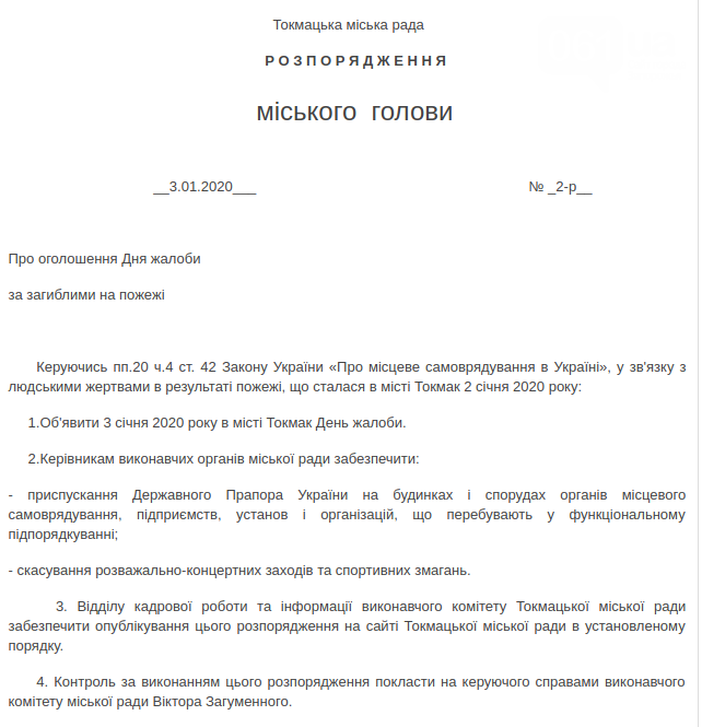 На сайте мэрии Токмака появилось распоряжение о признании 3 января траурным днем памяти о погибших во время пожара детей. В городе отменены все праздничные мероприятия, приспущены флаги на админ зданиях.