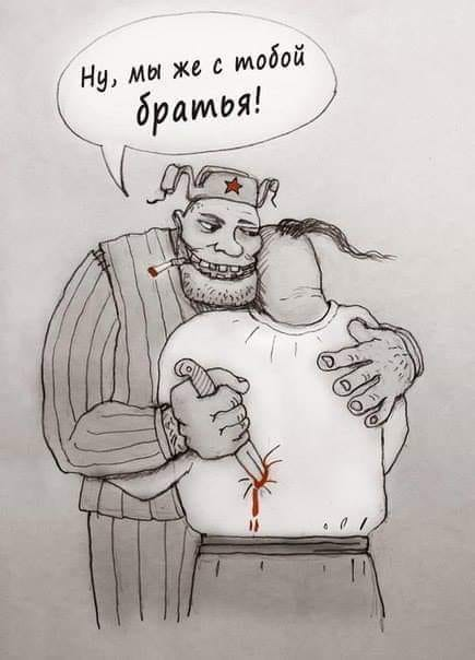 "Ну, мы же с тобой братья", - именно с такими словами персонаж обозначающий Россию обнимает украинца и втыкает ему в спину нож.