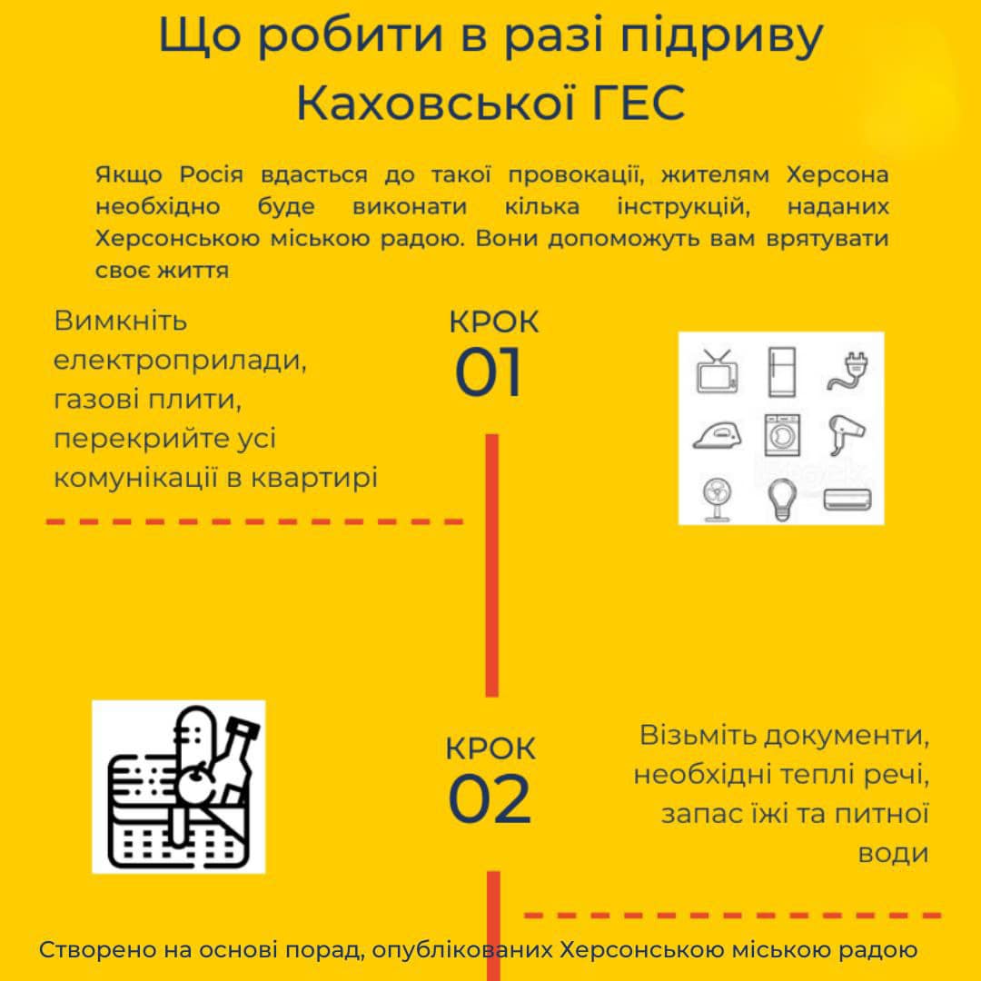 В результате подрыва плотины Каховской ГЭС существует риск затопления населенных пунктов поблизости. ОК "Юг" опубликовало инструкцию, как действовать местным жителям.
